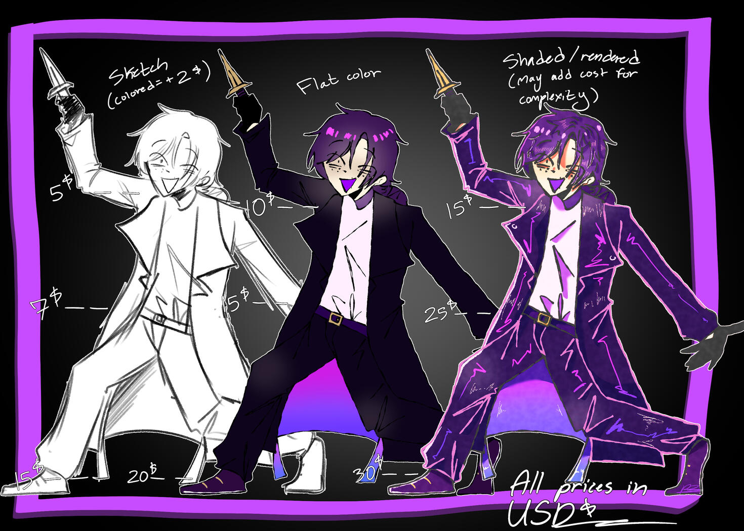 I can draw: humans/humanoids (object heads included), characters from media, OCs (must have reference sheet or will be charged extra), propsI can maybe draw: anthro/furry (depends on the animal and the complexity of the design), complex clothings/designs (may be charged extra depending), gore (depends on complexity; may be charged extra)I can't draw: Sexual NSFW, ferals, mecha/robots, real people, anything inherently bigoted.My style varies a lot. I do not have separate price references for shading styles, lineart styles, rendering and whatnot, so if you want a piece done a certain way I have to be told (like lined vs. lineless etc.) Complex lineart, rendering, and coloring styles may cost extra.